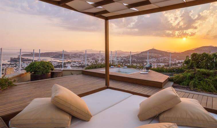 Die Dolce Vita Suite mit 35 m2 Schlafzimmer, 45 m2 Wohnzimmer und 220 m2 Terrasse bietet insgesamt 300 m2 stilvolle und dennoch minimalistische Luxusunterkünfte, die Ihr Konzept eines „Urlaubs in Bodrum“ neu definieren.